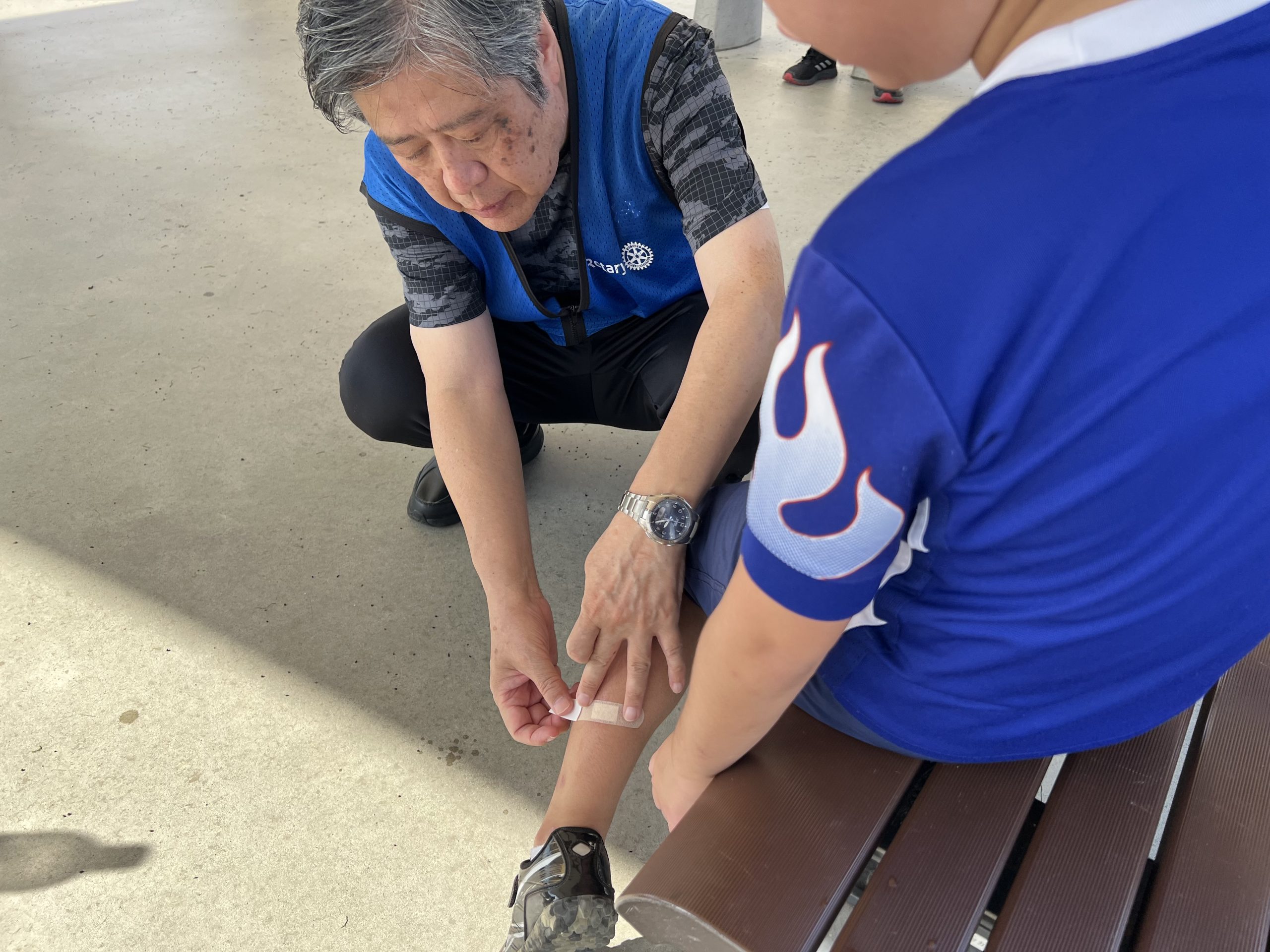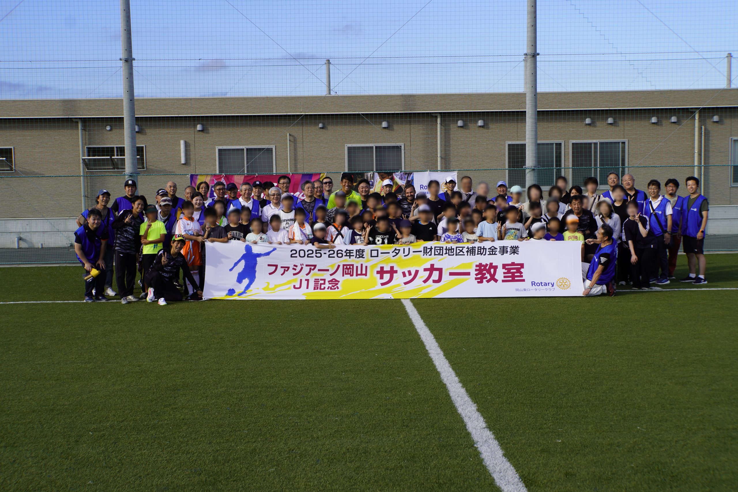 児童たちはこのような体験型のイベントに初めて参加する子も多く、プロのコーチから直接指導を受ける貴重な機会に、目を輝かせながら楽しそうにプレーする姿が印象的でした。さらに、現役選手の金山キーパーがサプライズで登場し、児童と一緒にプレーする場面では、歓声と笑顔があふれ、感動的なひとときとなりました。地元のプロチームを身近に感じ、応援する気持ちが育まれたことと思います。また、地区補助金事業として岡山東ロータリークラブの会員32名も参加し、誘導やボール拾いなどを通じて児童との交流を深め、会員同士の親睦も図ることができました。ご参加いただいた皆様に心より感謝申し上げます。