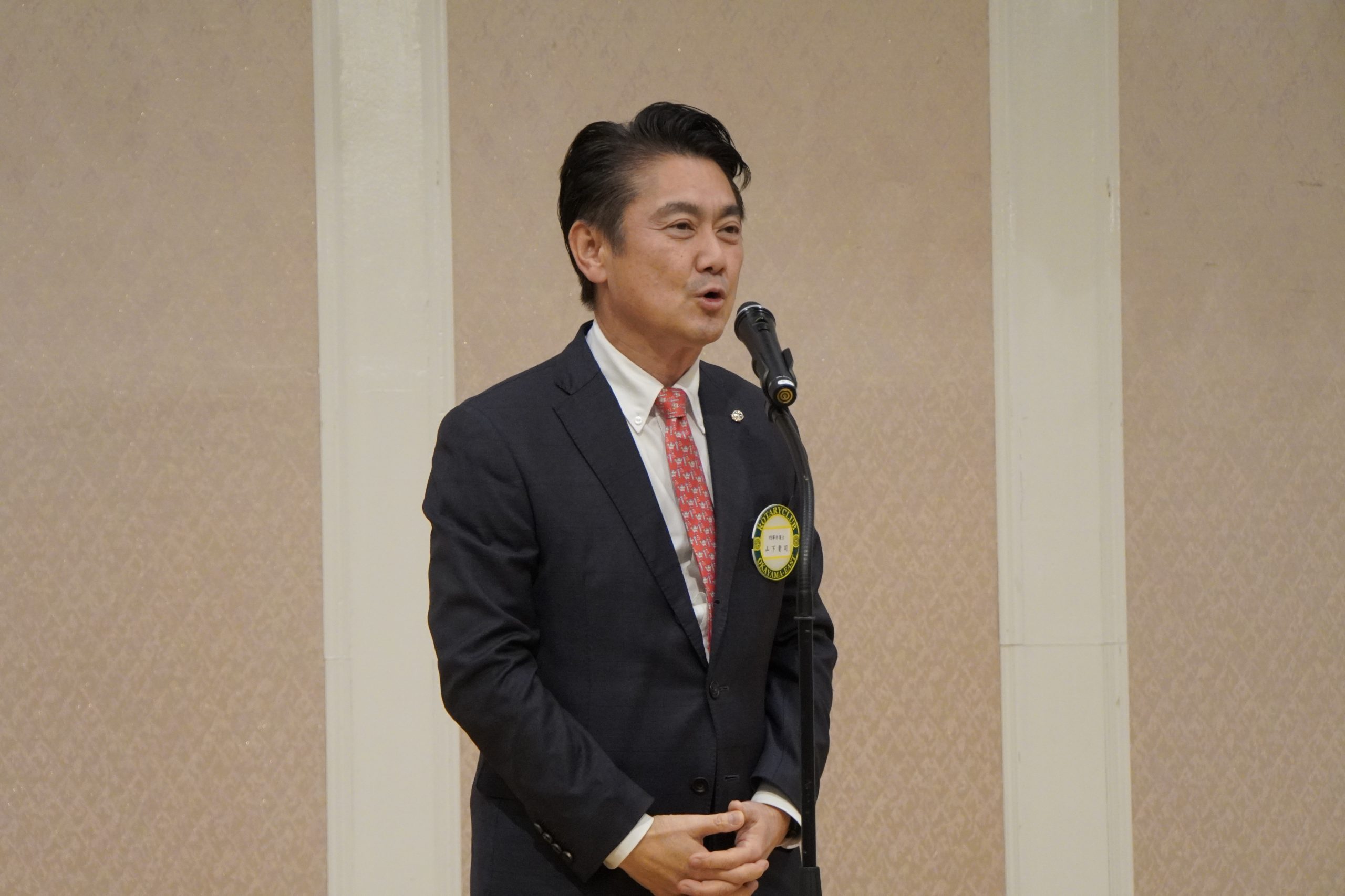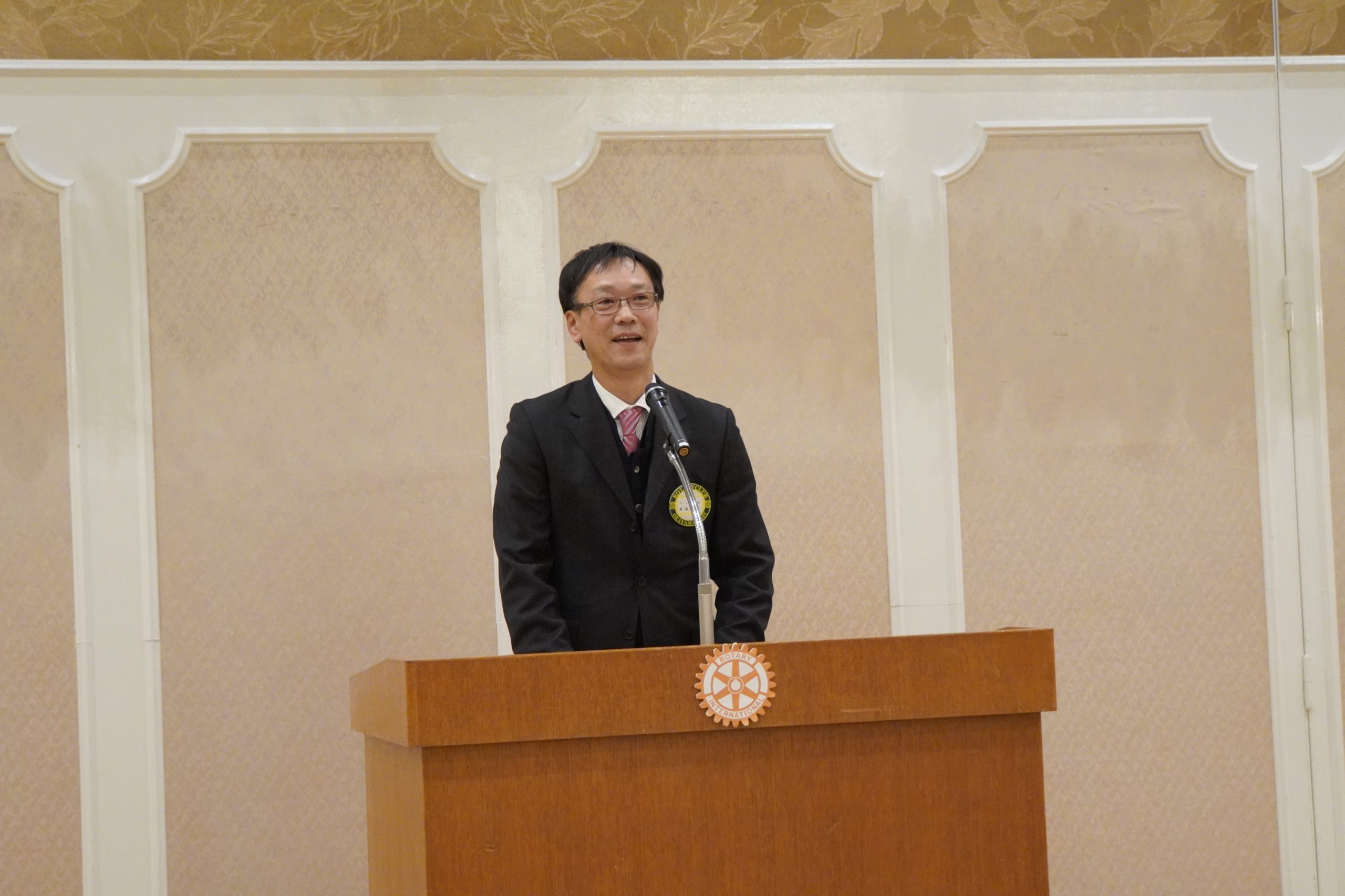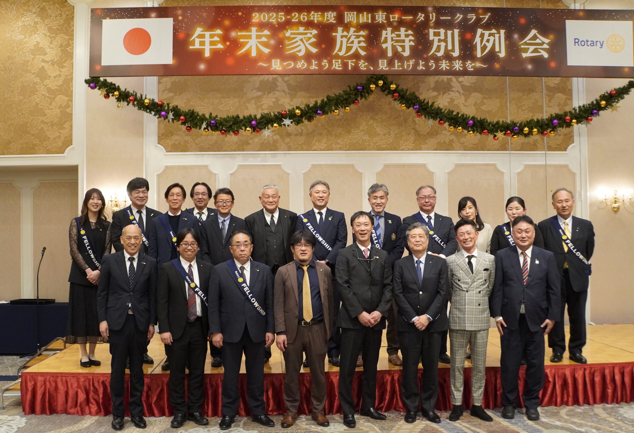 12月25日(木)、齋藤信也会長のもと、2025-26年度の年末家族特別例会が開催されました。親睦活動委員会・大塚学委員長を中心に、「家族への感謝」をテーマとして委員会メンバーが力を合わせ、入念な準備と協議を重ねて当日を迎えました。年末家族特別例会は、全国大会出場の実績を持つ創志学園高校マーチングバンドによる迫力ある演奏で幕を開けました。中盤では、齋藤会長、貝原副会長、福武S.A.A.、平井幹事の4名がサンタクロースに扮し、子どもたちへお菓子をプレゼント。大きな袋いっぱいのお菓子を見た子どもたちは終始笑顔で、とても嬉しそうな様子でした。