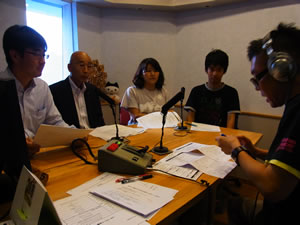 | 9月12日(木)17時20分より,西尾広報副委員長の ご尽力によりFM 岡山(JOVV-FM)の電波を通じて, 我がクラブが先月(8月17日~19日)行った宮城県気 仙沼市での奉仕活動について放送されました。これは,大震災から2年半となることから,FM 岡山に 働きかけ,現地で活躍した社会奉仕委員会の佐藤委員長,菅野副委員長と中国学園大学学生ボランティア代表ら4名が出演して,東北ボランティア活動の報告と気仙沼市の現状をスタジオから生放送したものであります。また舟橋幹事,若林広報委員長にも応援に駆け付けていただき,生放送に緊張しながらも,アナウンサーのリードのお蔭で無事に報告し,10月20日のシンポジウムの告知もさせていただきまし た。 この放送がロータリーの公共イメージ認知度の向上に少しでも役立っておれば幸いです。 [文章提供:佐藤社会奉仕委員長・若林広報委員長 写真提供:舟橋幹事] |